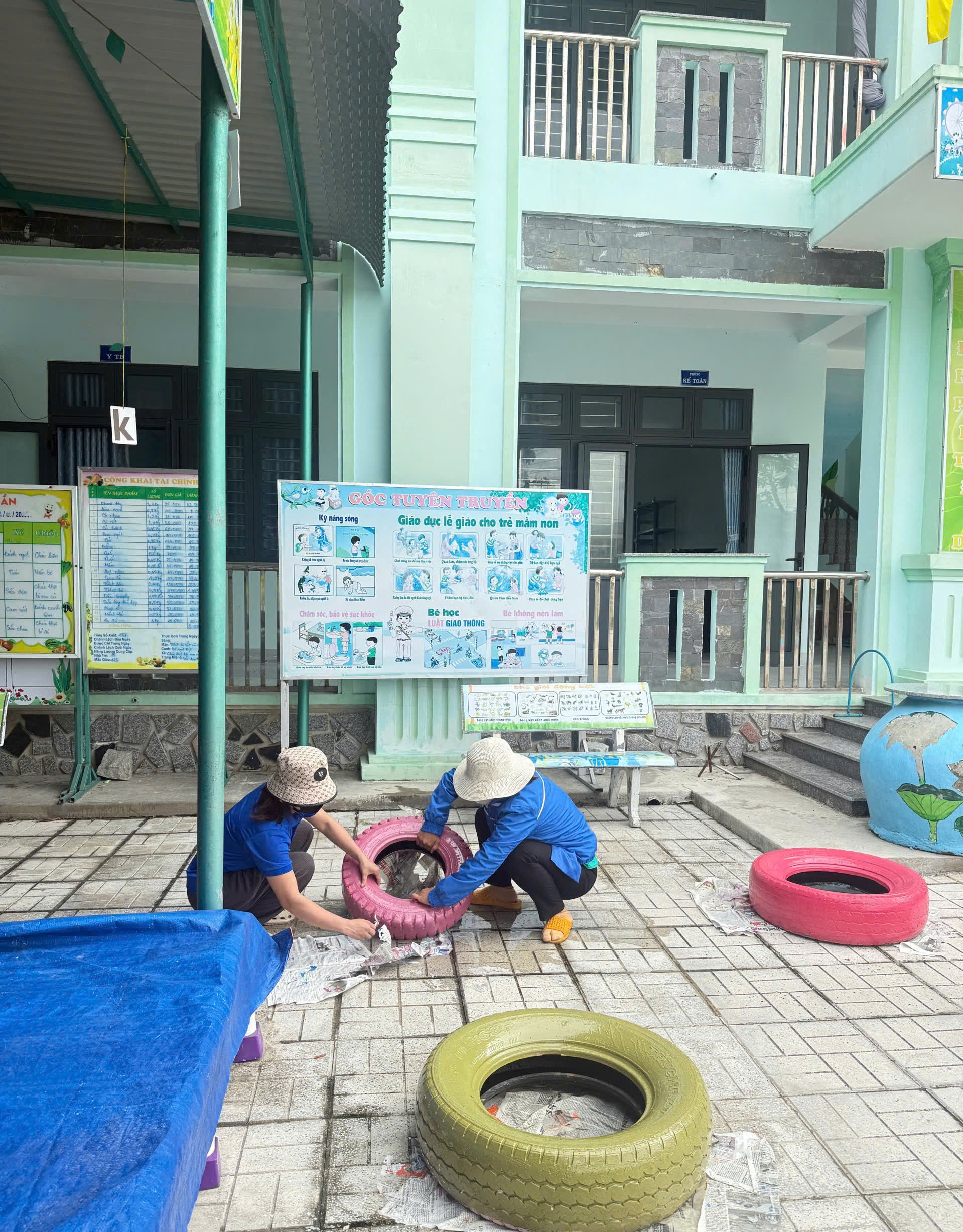 Chi đoàn Trường Mầm non Phổ Châu đã tích cực chung tay xây dựng cảnh quan ngoài trời bằng nhiều hoạt động sáng tạo: biến những chiếc lốp xe cũ thành bồn hoa rực rỡ, con vật ngộ nghĩnh, biển tuyên truyền sinh động; đồng thời làm thêm đồ chơi cho trẻ như cổng chui, bập bênh, … Những công trình tuy giản dị nhưng chứa đựng nhiều tâm huyết, góp phần tạo nên một không gian vui chơi an toàn – phong phú – hấp dẫn, đem lại cho các em nhỏ nhiều trải nghiệm ý nghĩa. 🌸