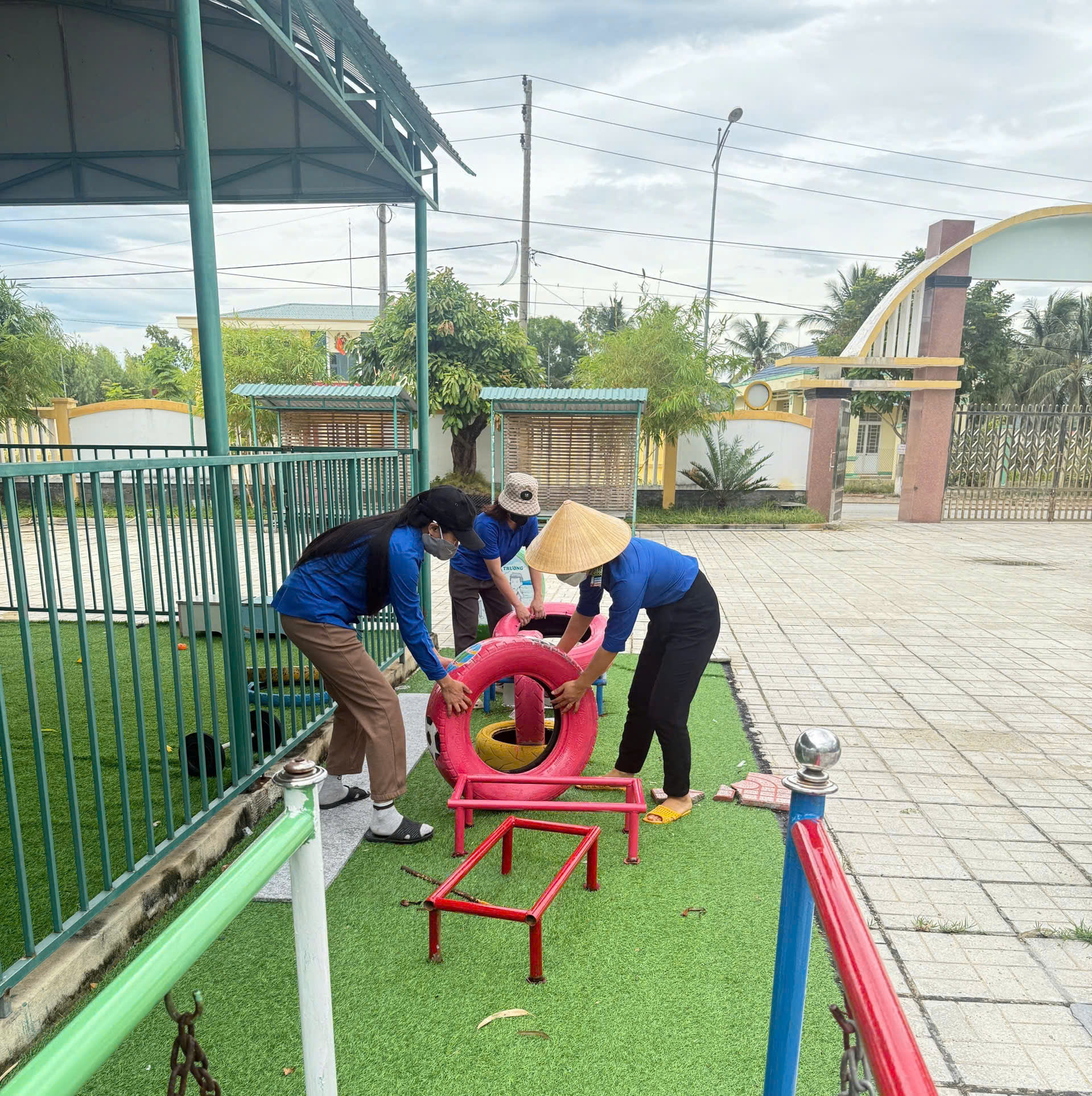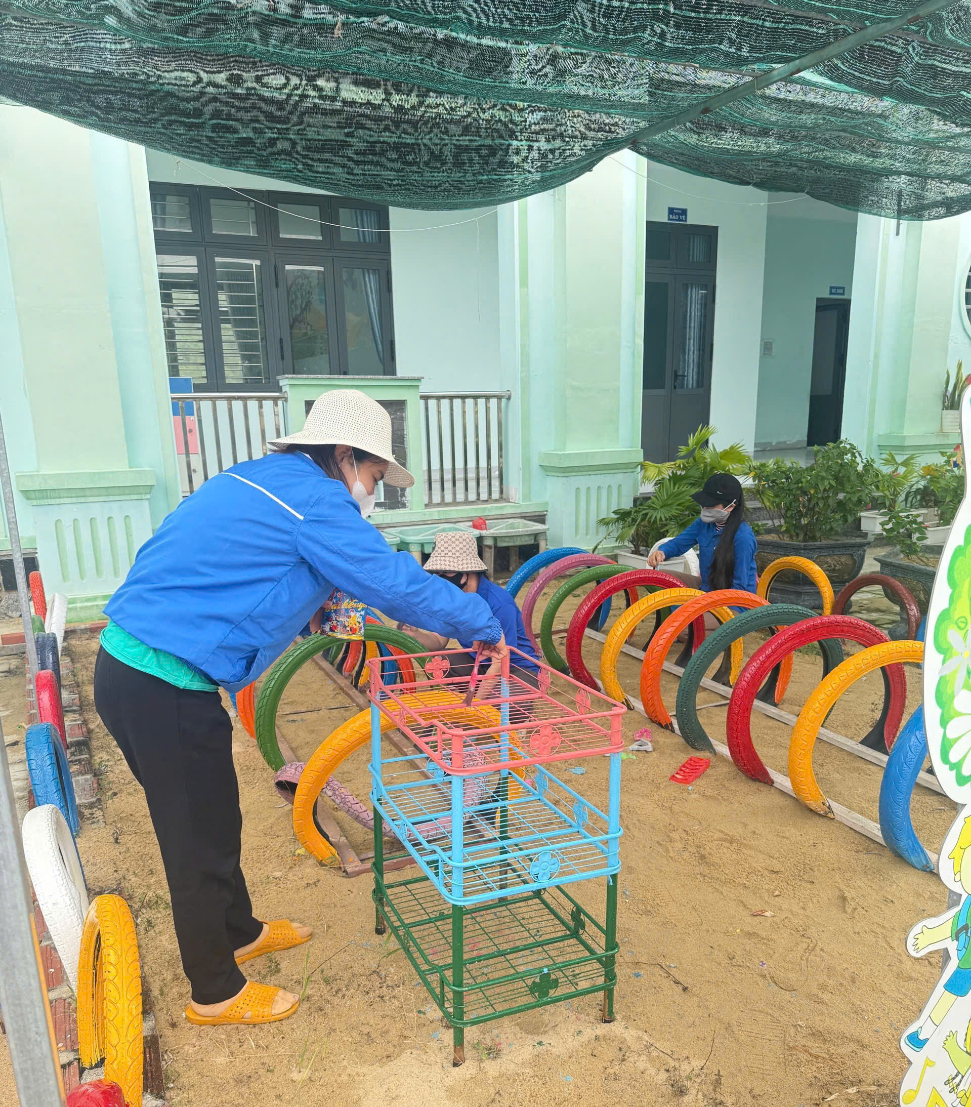 Chi đoàn thanh niên trường Mầm non Phổ Châu góp sức xây dựng môi trường học thân thiện, không gian ngoài trời thêm sắc màu từ bàn tay đoàn viên.