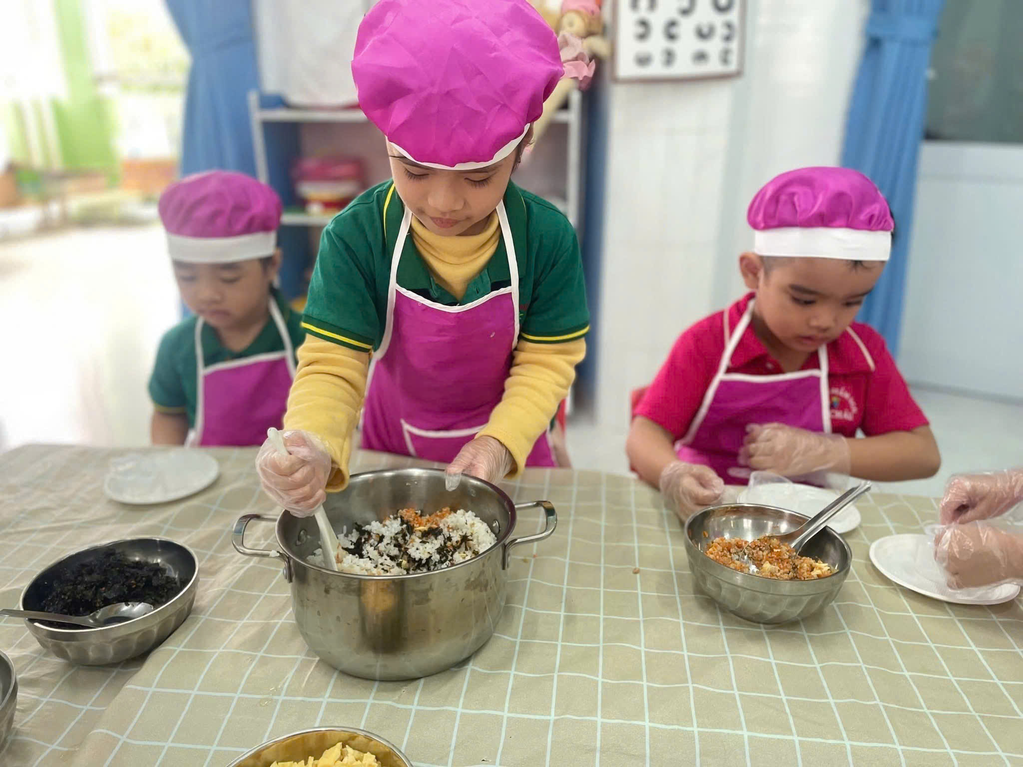 🌼 Dưới sự hướng dẫn nhẹ nhàng của cô, các bé xắn tay áo, đeo tạp dề và ngồi ngay ngắn vào bàn, sẵn sàng bắt tay vào hoạt động. Các bạn được trộn cơm, chia cơm ra đĩa và nhẹ nhàng nắm lại. Có bạn khéo tay thì nắm cơm tròn vo, gọn gàng, có bạn còn làm rơi vài hạt cơm xuống bàn rồi cười khúc khích đáng yêu, tạo nên những khoảnh khắc rất hồn nhiên.